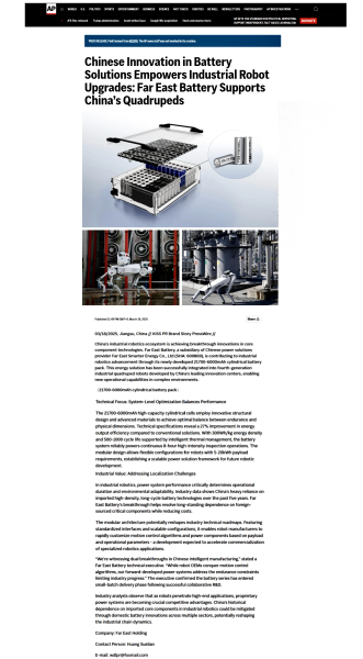 3月18日美聯(lián)社訊,中國機(jī)器人生態(tài)鏈正迎來關(guān)鍵部件領(lǐng)域的創(chuàng)新突破。中國電池制造商遠(yuǎn)東智慧能源股份有限公司(簡稱:遠(yuǎn)東股份 代碼:600869)旗下的遠(yuǎn)東電池近期憑借其創(chuàng)新研發(fā)的21700-6000mAh圓柱電池組,正在為機(jī)器人領(lǐng)域的發(fā)展貢獻(xiàn)自身力量。該電池組已成功搭載于中國頭部科創(chuàng)中心研發(fā)的第四代工業(yè)四足機(jī)器人,為復(fù)雜場景下的機(jī)器人應(yīng)用提供了新的能源解決方案。
