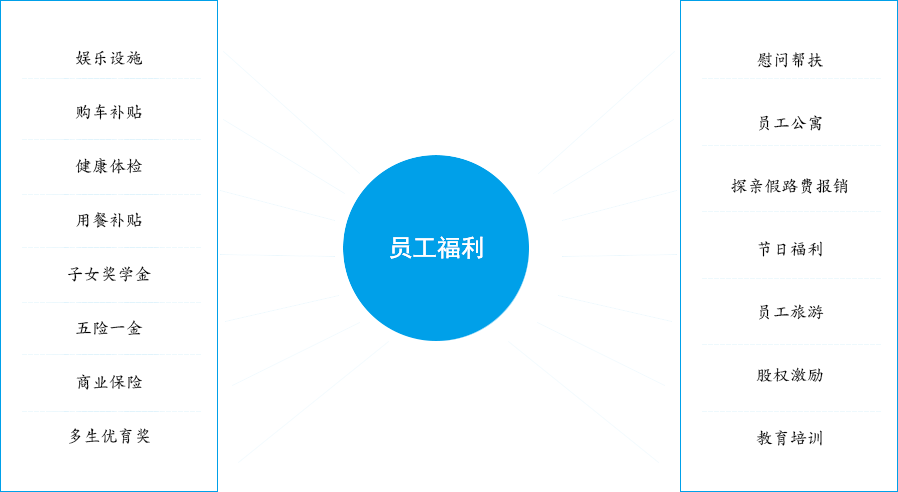 在法定福利的基礎上,公司為員工提供全方位的企業福利,涉及到員工衣食住行各個方面,共 計15大項,21個小項,為員工的生活雪中送炭、錦上添花